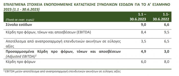 - Αύξηση εσόδων κατά 37% και αύξηση λειτουργικής κερδοφορίας (Adjusted EBITDA) κατά 62% σε ενοποιημένη βάση, σε σχέση με την αντίστοιχη περίοδο 2022. Τα κέρδη προ φόρων διαμορφώθηκαν σε χαμηλότερα επίπεδα σε σχέση με το πρώτο εξάμηνο του 2022 κυρίως ως αποτέλεσμα χαμηλότερων αναπροσαρμογών επενδύσεων σε εύλογη αξία.