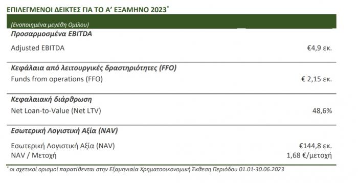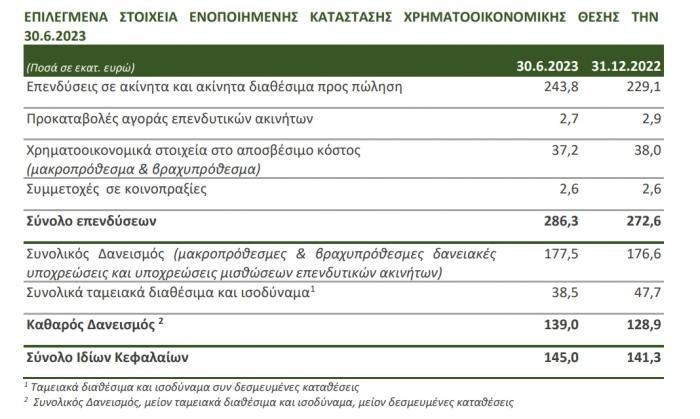 - Προσθήκη δύο (2) νέων επενδυτικών ακινήτων εντός του πρώτου εξαμήνου 2023. Αποκτήθηκαν ένα βιομηχανικό ακίνητο που φιλοξενεί τις εγκαταστάσεις παραγωγής του φυσικού μεταλλικού νερού ΙΟΛΗ και ένα αυτοτελές κτίριο στην Ξάνθη το οποίο ανακαινίζεται και θα λειτουργήσει ως φοιτητική εστία. Επιπλέον, αποκτήθηκε ένα όμορο με το Athens Heart οικόπεδο το οποίο εντάσσεται στο σχεδιασμό μετατροπής του ακινήτου σε πράσινο γραφειακό συγκρότημα, ο οποίος είναι σε εξέλιξη.