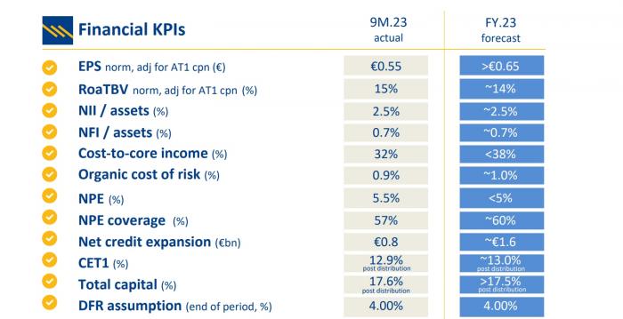 Ως αποτέλεσμα ενός πολύ ισχυρού τριμήνου, η καθαρή λογιστική αξία (Tangible book value) ανά μετοχή βελτιώθηκε σημαντικά στα 4,94 ευρώ με κέρδη ανά μετοχή 0,21 ευρώ. Σημαντική η συνεχιζόμενη αύξηση εσόδων από τόκους στα 531 εκατ. ευρώ και βελτίωση του καθαρού επιτοκιακού περιθωρίου από 1,61% πέρυσι, σε 2,72% το φετινό τρίτο τρίμηνο, με εκτίμηση ότι για το σύνολο του 2023 θα φθάσει στο 2,4%, επίπεδο στο οποίο μπορεί να παραμείνει και το επόμενο έτος, υπό την προϋπόθεση ότι θα επιβεβαιωθεί η εκτίμηση ότι η πρώτη μείωση επιτοκίων από την ΕΚΤ θα γίνει το νωρίτερο στο β’ εξάμηνο του 2024.