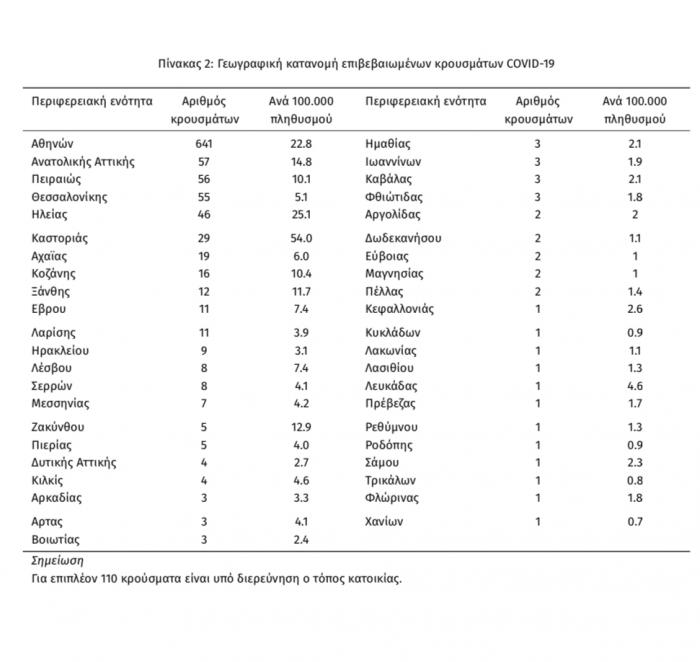 Όσον αφορά τη γεωγραφική κατανομή των κρουσμάτων στη χώρα η Αττική συγκεντρώνει τον μεγαλύτερο αριθμό και ακολουθούν κάποιες περιοχές της χώρας όπως η Θεσσαλονίκη, η Καστοριά, η Ηλεία, η Κοζάνη, η Αχαΐα και η Ξάνθη, όπου υπήρξαν εστίες νέων μολύνσεων και μεγαλύτερη απ' ότι φαίνεται έκθεση του πληθυσμού στον ιό. Όπως αποτυπώνεται και στον σχετικό χάρτη του ΕΟΔΥ ελάχιστες είναι πλέον οι περιοχές της χώρα όπου προς το παρόν επισήμως δεν έχει καταγράφει κάποιο κρούσμα κορονοϊού.