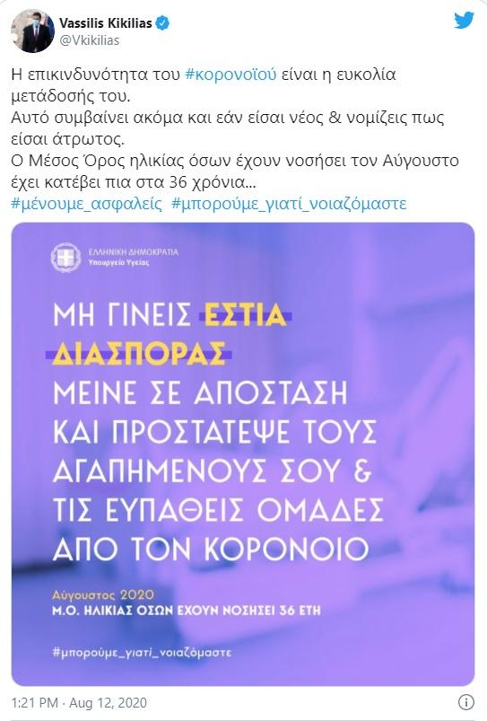 «Αυτό συμβαίνει ακόμα και εάν είσαι νέος & νομίζεις πως είσαι άτρωτος. Ο Μέσος Όρος ηλικίας όσων έχουν νοσήσει τον Αύγουστο έχει κατέβει πια στα 36 χρόνια...», έγραψε ο Βασίλης Κικίλιας.
