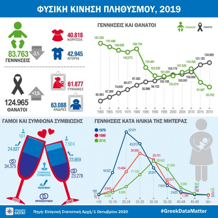 Οι γεννήσεις στην Ελλάδα πέρυσι ανήλθαν σε 83.763 (42.945 αγόρια και 40.818 κορίτσια), καταγράφοντας μείωση 3,1% σε σχέση με το 2018, που ήταν 86.440 (44.525 αγόρια και 41.915 κορίτσια). Στις γεννήσεις δεν συμπεριλαμβάνονται οι γεννήσεις νεκρών βρεφών, οι οποίες το 2019 ανήλθαν σε 454, αυξημένες κατά 35,5% σε σχέση με το 2018, που ήταν 335.
