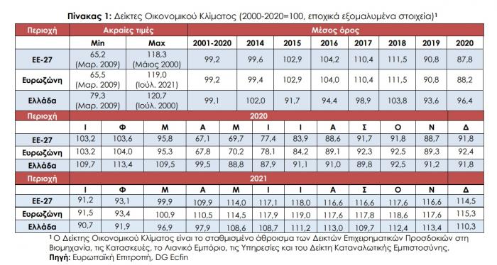 κινείται σε υψηλά επίπεδα και δεν ενσωματώνει τις πολύ πρόσφατες εξελίξεις της πανδημίας, με την έξαρση της νέας μετάλλαξης και τα μέτρα πολιτικής για την αντιμετώπισή της. Η υποχώρηση προήλθε κυρίως από την έντονη επιδείνωση των επιχειρηματικών προσδοκιών στις Υπηρεσίες και στις Κατασκευές, ενώ η μεταβολή στη Βιομηχανία ήταν ήπια.