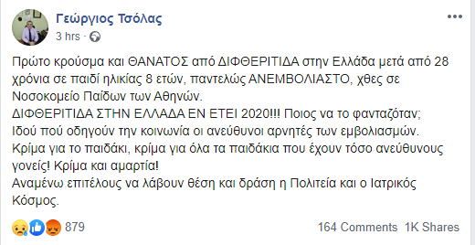 Το περιστατικό συνέβη στο Νοσοκομείο Παίδων Αγλαΐα Κυριακού με τον παιδίατρο Γεώργιο Τσόλα να αποκαλύπτει την ιστορία μέσω του Facebook. Όπως χαρακτηριστικά αναφέρει: «Πρώτο κρούσμα και ΘΑΝΑΤΟΣ από ΔΙΦΘΕΡΙΤΙΔΑ στην Ελλάδα μετά από 28 χρόνια σε παιδί ηλικίας 8 ετών, παντελώς ΑΝΕΜΒΟΛΙΑΣΤΟ, χθες σε Νοσοκομείο Παίδων των Αθηνών. ΔΙΦΘΕΡΙΤΙΔΑ ΣΤΗΝ ΕΛΛΑΔΑ ΕΝ ΕΤΕΙ 2020!!! Ποιος να το φανταζόταν;