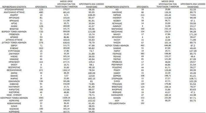 Κατανομή ανακοινωθέντων εγχώριων κρουσμάτων: Από το σύνολο των 8.753 νέων κρουσμάτων του νέου ιού στη χώρα 2 είναι εισαγόμενα. Η κατανομή των 8.751 νέων εγχώριων κρουσμάτων ανά Περιφερειακή Ενότητα παρουσιάζεται στον κατωτέρω πίνακα: