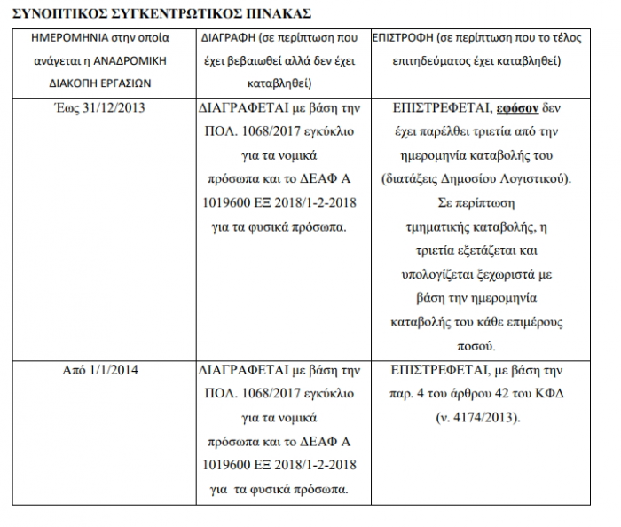 Συνεπώς, στην περίπτωση εκπρόθεσμης διακοπής εργασιών με αναδρομική ημερομηνία, το τέλος επιτηδεύματος πρέπει να επιβάλλεται μόνο για τον χρόνο (μήνες) άσκησης επιτηδεύματος και μέχρι την ημερομηνία της αποδεδειγμένης διακοπής εργασιών που έγινε αποδεκτή από τη Δ.Ο.Υ. και τα τέλη επιτηδεύματος που έχουν βεβαιωθεί από την ημερομηνία αυτή και μετά θα πρέπει να διαγράφονται εφόσον έχει υποβληθεί σχετική αίτηση στην αρμόδια Δ.Ο.Υ.