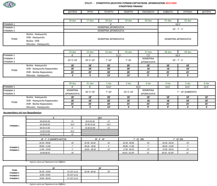 - Την Πέμπτη 2 Ιανουαρίου και την Παρασκευή 3 Ιανουαρίου τα δρομολόγια θα εκτελούνται ανά 10,5′ όλη τη μέρα.
