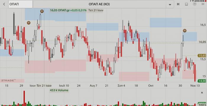 -- ΟΠΑΠ Ι: Ασυνήθιστο άδειασμα σε ποσοστό 3,18% για τον τίτλο, που έχασε τα 15 ευρώ, διακινώντας 707,2 χιλ. τεμάχια με 10,65 εκατ. ευρώ τζίρου. Η Eurobank Equities σε χθεσινή της έκθεση αφαίρεσε από τις κορυφαίες επιλογές της τη μετοχή, μειώνοντας οριακά το στόχο από τα 18 ευρώ στα 17,90 ευρώ, διατηρώντας όμως σύσταση αγοράς, καθώς αναμένει απόδοση 16,3% από τα τρέχοντα επίπεδα, που σε συνδυασμό με εκτιμώμενη μερισματική απόδοση 9,9% οδηγεί σε συνολική απόδοση 26,2%.