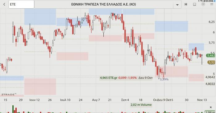 -- Εθνική: Ξεπέρασε με επιτυχία το χθεσινό τεστ, μετά τις ανακοινώσεις για το placement, που αρχίζει σήμερα (θα διατεθεί το 20% + 2% των μετοχών με το εύρος τιμών μεταξύ 5 και 5,44 ευρώ). Νωρίς στη συνεδρίαση, η μετοχή υποχώρησε ως τα 5,309 ευρώ, αλλά στη συνέχεια κέρδισε έδαφος, ανέβηκε ως τα 5,5 ευρώ και έκλεισε στα 5,482, με άνοδο 0,77%. Είχε τον μεγαλύτερο τζίρο στη συνεδρίαση (13,5 εκατ. ευρώ), μετά βεβαίως την Alpha που ήταν εκτός συναγωνισμού, αφού πέρασαν τα πακέτα του ΤΧΣ στη Unicredit. Το χθεσινό κλείσιμο πάνω από το ανώτατο σημείο του ορίου για την τιμολόγηση του placement είναι μια ενθαρρυντική εξέλιξη, που παραπέμπει σε μια τιμολόγηση στα υψηλά του εύρους που δόθηκε (σημειωτέον ότι η τιμή θα προσδιοριστεί με βάση το διεθνές βιβλίο προσφορών). Το γεγονός ότι οι παλαιοί μέτοχοι θα έχουν προτεραιότητα στην τελική κατανομή βοήθησε χθες τη μετοχή, περιορίζοντας τις κινήσεις αμπιτράζ (πώληση τώρα με προσδοκία αγοράς σε χαμηλότερη τιμή μέσω του placement). Η ζήτηση είναι μεγάλη και η επιτυχία της συναλλαγής θεωρείται βέβαιη. Μένει να φανεί ποιες θα είναι οι νέες ισορροπίες που θα βρει το επόμενο διάστημα η μετοχή, μετά την πολύ μεγάλη αύξηση του free float.