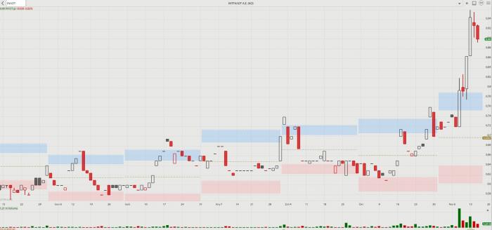 -- Intrakat: Το εντυπωσιακό με τον τίτλο είναι ότι κρατάει όλα τα κέρδη του. Έμεινε καιρό στη ζώνη των 3 ευρώ, «μπετονάροντας» την περιοχή, ενώ το πρώτο 15ήμερο του Νοεμβρίου κερδίζει περίπου μισό ευρώ ανά μετοχή, ή ποσοστό +15,28%. Χθες έκλεισε στα 3,47 ευρώ με άνοδο 0,29%, όμως το εντυπωσιακό είναι ότι έκανε 2 εκατ. τεμάχια όγκο, μέσω τζίρου 3,26 εκατ. ευρώ, δηλαδή πάνω από τις μισές συναλλαγές που έγιναν στον Mid Cap, που διακίνησε 6,24 εκατ. ευρώ.