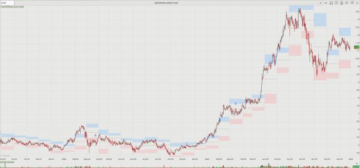-- Aegean Airlines: Έβγαλε το 2023 στην τρίτη θέση των αποδόσεων στον Large Cap με άνοδο 114,37% κλείνοντας το έτος στα 11,34 ευρώ, ενώ στα τέλη Αυγούστου έφτασε έως τα 13,80 ευρώ ενδοσυνεδριακά, που είναι ιστορικά υψηλά. Το 2023 ο όμιλος έκλεισε την καλύτερη χρήση της ιστορίας του, τόσο από πλευράς πτητικού έργου, όσο και από πλευράς αποτελεσμάτων, ενώ επαναγοράζει τα warrants από το κράτος για τη βοήθεια που είχε δεχτεί το 2020 λόγω της ζημιάς του Covid-19. Μέσω της δημιουργίας του πρώτου οικοσυστήματος υπηρεσιών υποστήριξης της αεροπορικής βιομηχανίας στην Ελλάδα, σε σύμπραξη (joint venture) με την καναδική CAE, η Aegean αλλάζει επίπεδο. Το πρόβλημα με τους κινητήρες στα νέα της αεροσκάφη στόλαρε και τη μετοχή, κάτι όμως που ίσως αποδειχθεί ευκαιρία τοποθετήσεων.
