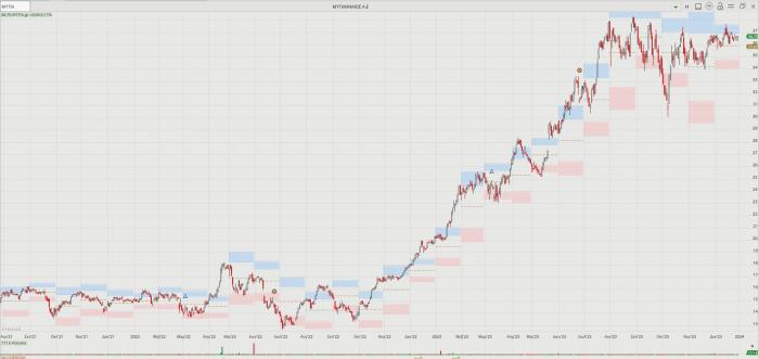 -- Mytilineos: Σταθερή επιλογή, τόσο στις καλές όσο και στις κακές εποχές της αγοράς. Έβγαλε το 2023 με ράλι +81,79% κλείνοντας στα 36,70 ευρώ, έχοντας ιστορικό υψηλό στα 38,30 ευρώ από τον περασμένο Αύγουστο. Πλήθος εγχώριων αλλά και διεθνών οίκων, δίνουν τιμές – στόχους στα 45 και 46 ευρώ. Η μετοχή έχει τρομερή συνέπεια τα τελευταία χρόνια, αντανακλώντας τον εντυπωσιακό επιχειρηματικό μετασχηματισμό του ομίλου, ο οποίος με ένα μπαράζ εξαγορών καθίσταται ένας ολοκληρωμένος και καθετοποιημένος πάροχος ενέργειας, αποτελώντας και έναν από τους μεγαλύτερους «παίκτες» στο χώρο των μετάλλων και δη του αλουμινίου στην Ευρώπη. Παράλληλα, έχει καταστεί ένας από τους δέκα κορυφαίους κατασκευαστές ενεργειακών έργων παγκοσμίως, έχοντας και την «προίκα» της ΜΕΤΚΑ. Ο μεγάλος στόχος είναι η είσοδος στον FTSE 100 του Λονδίνου. Μικροί και μεγάλοι επενδυτές πίνουν νερό στο όνομα του Ευάγγελου που βλέπει και την αγορά του Λονδίνου.