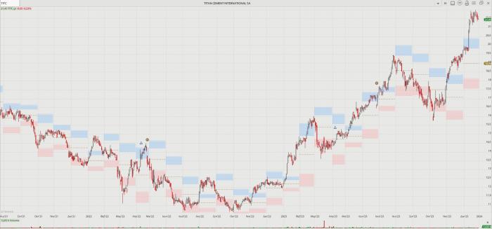 -- Τιτάν: Έβγαλε το 2023 με άνοδο 77,86% και διαρκή ιστορικά υψηλά από τότε που έκανε την τριπλή εισαγωγή σε Βρυξέλλες, Παρίσι και Αθήνα, προ περίπου πεντέμισι ετών. Ξεκίνησε το έτος από τα 12,06 ευρώ και το ολοκλήρωσε στα 21,45 ευρώ. Βρίσκεται στην πλέον αναπτυξιακή φάση των 121 χρόνων ιστορίας της, καθώς στις περισσότερες αγορές στις οποίες δραστηριοποιείται υπάρχει οικοδομικός οργασμός, μεγάλα έργα υποδομών, ενώ υλοποιεί και μεγάλο πρόγραμμα «πράσινου» μετασχηματισμού.