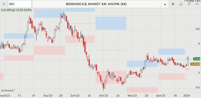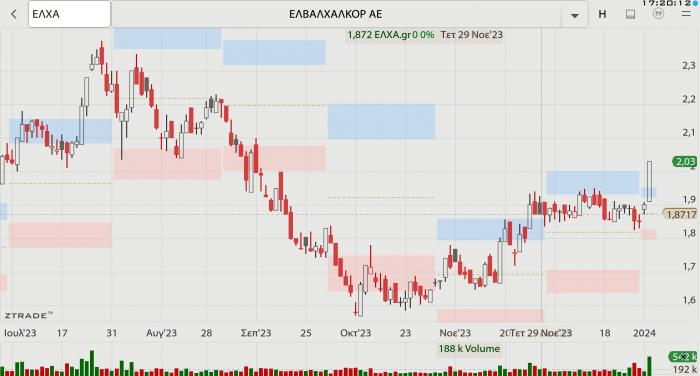 -- Viohalco: Δυναμικό +4,54% χθες με κλείσιμο στα 5,53 ευρώ. Και εδώ, ζητούμενο είναι η διάρκεια, την οποία, το τελευταίο τρίμηνο, δεν έχει, καθώς χάνει άνω του 20% από τα υψηλά του Αυγούστου. Έβγαλε το 2023 με άνοδο 31,34%, όμως έως τις 30 Αυγούστου 2023 έφτασε να κερδίζει 75%, καθώς τότε είχε φτάσει στα 7,13 ευρώ, που είναι ιστορικά. Ο όμιλος αποτιμάται στα 1,43 δισ. ευρώ, ενώ αν προστεθούν οι αποτιμήσεις των Cenergy Holdings και ElvalHalcor, τις οποίες ελέγχει κατά 79,78% και 87,78% αντίστοιχα, τότε η… δίκαιη κεφαλαιοποίησή της, είναι πολύ πιο πάνω. Παράλληλα, ελέγχει και τη Noval Properties, που είναι η δεύτερη σε χαρτοφυλάκιο ΑΕΕΑΠ της χώρας και ετοιμάζεται να εισαχθεί στο Χ.Α. Πρόκειται για το μεγαλύτερο βιομηχανικό όμιλο της χώρας.