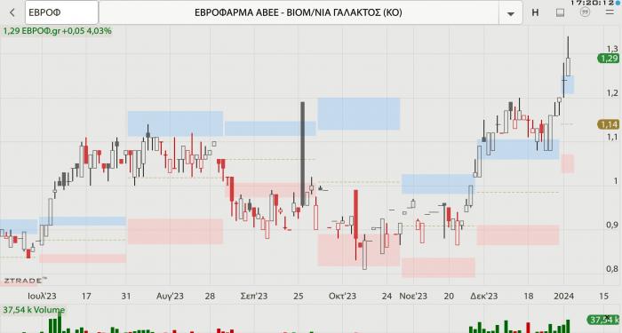 -- Εβροφάρμα Ι: Νέα υψηλά 4ετίας για τη μετοχή που ήσυχα και αθόρυβα βελτιώνει την εικόνα της τελευταία. Έκλεισε με άνοδο 4,03% χθες στα 1,29 ευρώ, επίπεδα που έχει να δει από το 2019. Στα επίπεδα των 1,29 ευρώ είχε να βρεθεί από τις 20 Φεβρουαρίου 2020, που σημαίνει ότι μόλις τώρα κλείνει την… ψαλίδα της πτώσης λόγω Covid-19. Το τελευταίο τριήμερο (με πολύ ανεβασμένους όγκους) κερδίζει 11,21%, ενώ έχει να δει πτώση πάνω από έξι συνεδριάσεις, κερδίζοντας 15,18%. Μάλιστα, από την 1η Δεκεμβρίου, ενισχύεται κατά 25,24%. Το πρώτο εξάμηνο του 2023 οι ενοποιημένες πωλήσεις αυξήθηκαν κατά 19,63% και ανήλθαν σε 23,562 εκατ. ευρώ, έναντι 19,695 εκατ. ευρώ το αντίστοιχο διάστημα του 2022. Τα ενοποιημένα καθαρά κέρδη μετά από φόρους ανήλθαν διαμορφώθηκαν στα 1,416 εκατ. ευρώ έναντι ζημιών 22 χιλ. ευρώ το 2022.
