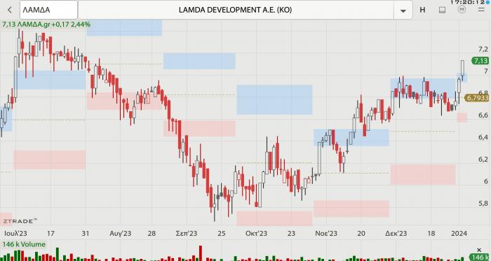 -- Lamda Development: Επίσης καλό ξεκίνημα έτους, μετά το +2,96% της της Τρίτης, χθες έκλεισε στο +2,44%, ενώ έχει συμπληρώσει 4ήμερο ανοδικό σερί με κέρδη 6,90%. Έκλεισε πάνω από τα 7 ευρώ για πρώτη φορά από τις 7 Αυγούστου 2023, ενώ στα 7,13 είχε να βρεθεί από τις 28 Ιουλίου, που σημαίνει ότι είναι σε υψηλό 5μήνου. Χθες ανακοινώθηκε πως θα γίνει μείωση του μετοχικού της κεφαλαίου της Lamda Malls κατά 38,300 εκατ. ευρώ, μέσω ακύρωσης 38.300.000 μετοχών, με σκοπό την επιστροφή ισόποσου κεφαλαίου σε μετρητά στην Lamda Development.