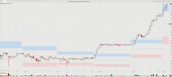 -- Intrakat: «Τρελό» κρεσέντο ανόδου, πιθανότατα υπάρχει και υπερβολή μέσα σε αυτό. Όμως, όπως φαίνεται, εγχώριοι και ξένοι χτίζουν στην προοπτική, σε αυτά που βλέπουν ότι έρχονται. Ο όμιλος αλλάζει πίστες ραγδαία, απέκτησε την Άκτωρ, που παρά τα προβλήματα του παρελθόντος παραμένει ισχυρή και με επιβλητικό παλμαρέ έργων. Με την εξαγορά, η Intrakat ανέβασε το ανεκτέλεστο στα 4,9 δισ. ευρώ. Συνάμα, φαίνεται πως ετοιμάζονται δυνατές κινήσεις και στη Ρουμανία, μια αγορά με πολύ… ψωμί για κατασκευές και ενέργεια. Έβγαλε το 2023 στο +213%, ενώ από τις αρχές Δεκεμβρίου, σε 22 συνεδριάσεις, έχει μόλις μία πτωτική, κερδίζοντας 41,21%! Χθες έκλεισε στα 4,90 ευρώ, με την αποτίμηση στα 786 εκατ. ευρώ. Πλέον, ξεπερνά τέσσερις εταιρείες του FTSE 25 (Σαράντη, Quest, Autohellas και ΕΥΔΑΠ) και, αν συνεχίσει έτσι, σε μια από τις επόμενες αναθεωρήσεις, θα τη δούμε στους μεγάλους του Large Cap.