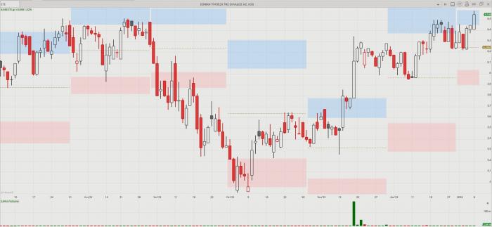 -- ΔΕΗ: Νέα υψηλά σχεδόν δέκα ετών, έκλεισε με νέα άνοδο 1,18% στα 12,05 ευρώ. Πάνω από τα 12 ευρώ είχε να κλείσει από τον Απρίλιο του 2014. Κίνηση μόνιμα σε θετικό έδαφος, έφτασε έως το +3,11%. Με… αρχοντικό τζίρο πάνω από 10 εκατ. ευρώ, αποτιμάται πλέον στα 4,6 δισ. ευρώ που τη φέρνει στην 7η θέση όλου του Χ.Α. Υπάρχουν καλές προσδοκίες από το road show στο Λονδίνο στις 23 Ιανουαρίου. Η Fast Finance ΑΕΠΕΥ σημειώνει: «Πιστεύουμε ότι η ΔΕΗ είναι μια από τις κορυφαίες επιλογές για το 2024. Το ημερήσιο ‘stop long’ έχει ανέβει στο 11,03 σε κλείσιμο ημέρας, με την στήριξη στο 11,38. Όσο ο τίτλος δίνει κλεισίματα πάνω από τα 11,80, μπορεί να δώσει άμεση συνέχιση. Μεσοπρόθεσμα ο στόχος μας είναι στα 16,30 ευρώ».