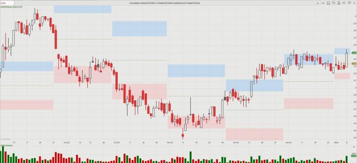 -- ΕΧΑΕ: Με τις μέσες συναλλαγές το 2023 στα 111 εκατ. ευρώ (υψηλό 9ετίας), νέες εισαγωγές, αυξήσεις κεφαλαίου, ομόλογα και γενική ανοδική πορεία της αγοράς, επόμενο είναι να επηρεαστεί. Στο +4,52% χθες, και στα 5,50 ευρώ, με καλούς όγκους και τζίρους. Παρ’ όλα αυτά, απέχει από τα υψηλά των 6,13 ευρώ του περασμένου καλοκαιριού, μολονότι ο Γ.Δ. βρίσκεται πολύ κοντά στα υψηλά του, όπως και πολλά blue chips. Στο +71% πέρυσι.