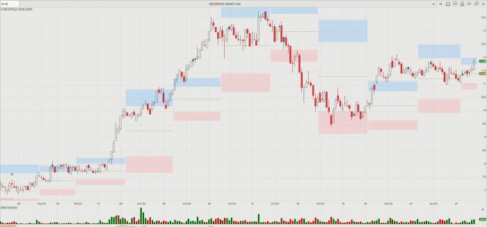 -- Aegean Airlines: Προσπαθεί να βρει εκ νέου τα ανοδικά της πατήματα. Έχει μόνο μια πτωτική το 2024, ενώ στις εφτά τελευταίες συνεδριάσεις, κερδίζει 6,44%. Χθες έκλεισε στα 11,90 ευρώ με άνοδο 2,59%, ενώ έφτασε έως το +3,45% και στα 12 ευρώ.