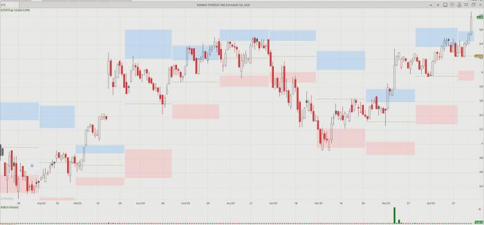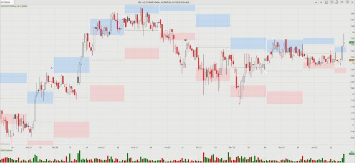 -- ΓΕΚ Τέρνα: Προσπαθεί να «σπάσει» τη συσσώρευση, αλλά φαίνεται ότι έχει βαρίδια. Τρίτη διαδοχική ανοδική, έφτασε έως το +2,95% χθες και στα 13,98 ευρώ, όμως δεν μπόρεσε να κάνει την υπέρβαση και έκλεισε στο +0,88% και στα 13,70 ευρώ. Υπολείπεται πάνω από 1 ευρώ από τα υψηλά των 14,84 ευρώ του καλοκαιριού. Πάντως, οι αναλυτές της Fast Finance ΑΕΠΕΥ τονίζουν πως «έχοντας συσσωρεύσει μεγάλο διάστημα, έκανε το "break out" με μεγάλο στόχο τα 17,5 ευρώ».