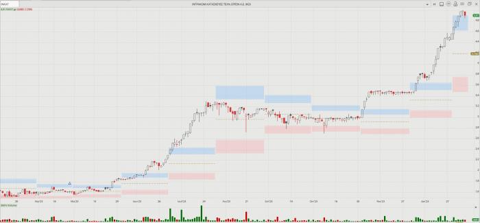 -- Intrakat: Μετά από 18 συνεδριάσεις, και άνοδο 33%, καθώς από τις 11 Δεκεμβρίου δεν είχε πτώση, χθες διόρθωσε σε ποσοστό 1,70% με κλείσιμο στα 4,91 ευρώ. Από τις αρχές του Δεκέμβρη έχει μόλις δύο πτωτικές συνεδριάσεις, με συνολικό ράλι +41,50%. Στο +213% το 2023, στο +7,44% το 2024. Έχει πολύ… λίπος να κάψει…