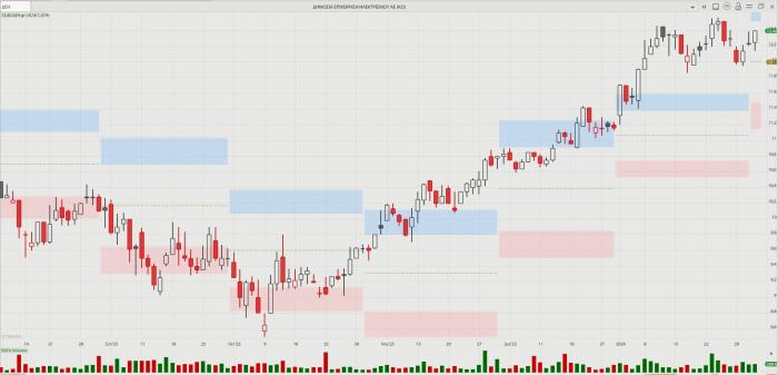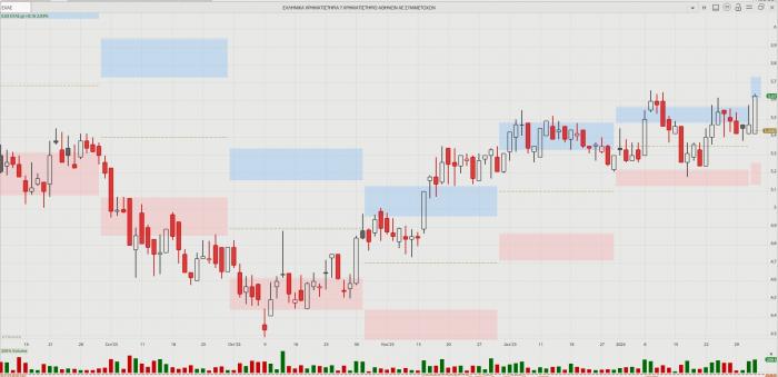 -- ΕΧΑΕ: Δυναμική κίνηση χθες, με άνοδο 2,93% και κλείσιμο στα 5,63 ευρώ με όγκο 208,8 χιλ. τεμάχια και τζίρο 1,15 εκατ. ευρώ. Η μετοχή, κατά τη γνώμη μας «χρωστάει» πολύ καλύτερη πορεία. Υπολείπεται ακόμη από τα υψηλά του καλοκαιριού (6,13 ευρώ από τις 20 Ιουλίου), τη στιγμή που ο Γ.Δ. έκλεισε χθες σε υψηλά 13 ετών. Εν μέσω κατακόρυφης αύξησης των συναλλαγών, με εκδόσεις ομολόγων, νέες εισαγωγές (Αεροδρόμιο), νομοτελειακά πρέπει να επηρεαστεί. Το 2022 υποχώρησε κατά 16,4%, όμως πέρυσι έδωσε απόδοση 71%. Φέτος είναι στο +6,23%. Η Alpha Finance έχει δώσει τιμή στόχο τα 6,68 ευρώ.