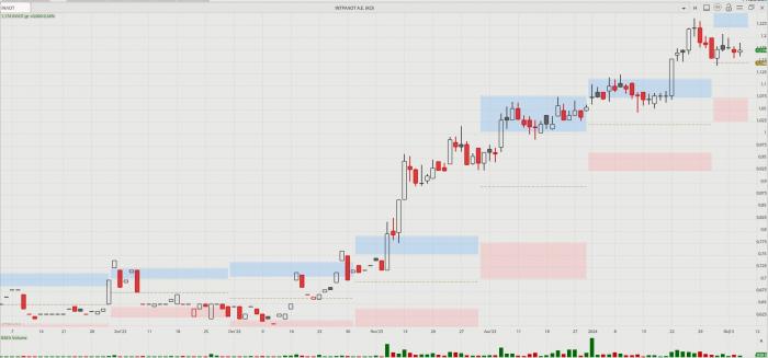 -- Ικτίνος: Από τα τέλη Σεπτεμβρίου ταλαιπωρείται η μετοχή σε τιμές κάτω από τα 0,50 ευρώ. Χθες, όμως, έδειξε… άγριες διαθέσεις. Με ένα άλμα 11,59% ήταν δεύτερη σε άνοδο στην αγορά μετά το ΔΑΑ και εύκολα ξεπέρασε το όριο του μισού ευρώ, κλείνοντας στα 0,52 ευρώ. Μάλιστα, η ανοδική κίνηση συνοδεύτηκε από αρκετά υψηλές, για τα δεδομένα της μετοχής, συναλλαγές, που ανήλθαν σε 737.534 ευρώ. Η συνέχεια θα δείξει αν ήταν μια παροδική ανοδική εκτόνωση μιας μετοχής που είχε μείνει πίσω, ή αν η χθεσινή άνοδος σηματοδοτεί κάτι μεγαλύτερο.