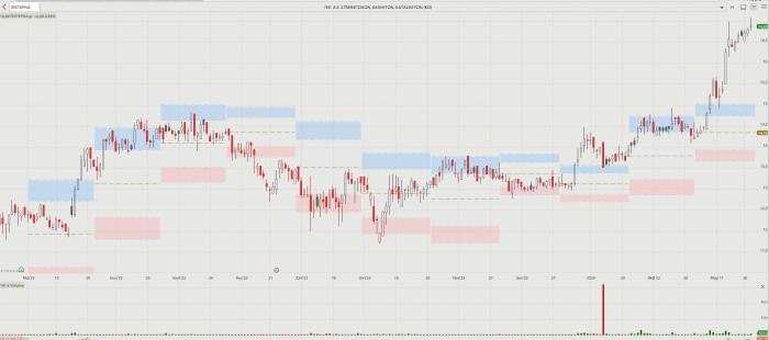 -- ΓΕΚ Τέρνα: Έβγαλε τον Μάρτιο με άνοδο +18,50%, ενώ το τρίμηνο είναι στο +28,30%, κλείνοντας στην τελευταία συνεδρίαση στα 16,88 ευρώ, που είναι νέα υψηλά 24 ετών. Πλέον, αποτιμάται στα 1,74 δισ. ευρώ, που τη φέρνει στη 15η θέση στον Large Cap μετά από χρόνια. Την περασμένη εβδομάδα υπογράφηκε και η μεγάλη παραχώρηση της Εγνατίας Οδού, με τον όμιλο πλέον να έχει υπό την αιγίδα του τα κορυφαία projects που μέλλουν να υλοποιηθούν στη χώρα μας, όπως είναι το τμήμα Χανιά – Ηράκλειο του Βόρειου Οδικού Άξονα Κρήτης (ΒΟΑΚ), το αεροδρόμιο στο Καστέλι, το καζίνο στην Αθήνα, την Αττική Οδό και πολλά άλλα. Κλειδί το deal της Τέρνα Ενεργειακή που θα συμβάλει αποφασιστικά στην απομόχλευση της μητρικής, το μοναδικό σημείο που απασχολεί την αγορά. Όπως έχουμε σημειώσει αν η συμφωνία ολοκληρωθεί τα οφέλη για την ΓΕΚ Τέρνα θα είναι πολλαπλασιαστικά.