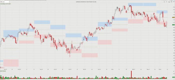 -- ΔΕΗ: Συνεχίζει να μην μπορεί να ξεφύγει από τη μετριότητα τελευταία, με απώλειες το τελευταίο διάστημα -8,07%. Η μετοχή παραμένει κοντά στα χαμηλά της βύθισης κατά -10% που πραγματοποίησε τις προηγούμενες ημέρες και ίσως δούμε ένα catch up αυτή την εβδομάδα.