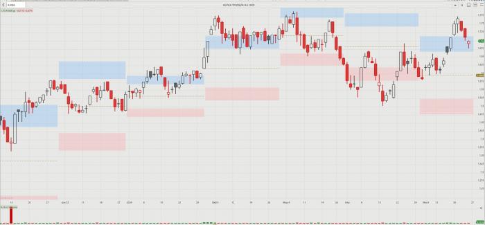 -- Alpha Bank: Διορθωτικά κινήθηκε στις τελευταίες συνεδριάσεις της προηγούμενης εβδομάδας η μετοχή, μετά από ένα εξαήμερο ισχυρά ανοδικό ξέσπασμα. Ωστόσο, στο γύρισμα της Παρασκευής (τρίτη πτωτική ημέρα) βγήκαν σημαντικές εντολές αγοράς, οι απώλειες καλύφθηκαν και τελικά η μετοχή έκλεισε με απώλειες -0,67%, μακριά από τα χαμηλά ημέρας. Δέλεαρ για τη μετοχή το υψηλό discount.