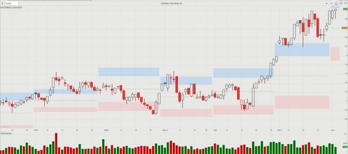 -- Cenergy Holdings: Νέα ιστορικά υψηλά τα 9,04 ευρώ, καθώς χθες, σε μια δύσκολη συνεδρίαση, ενισχύθηκε κατά 0,44% κλείνοντας στο υψηλό ημέρας, ενώ γύρισε από απώλειες 1,89%. Η απόβαση στην Αμερική, «τρέφει» τις προσδοκίες. Άλλη μια περίπτωση που πολλοί αναλυτές, αλλά και επενδυτές, άργησαν χαρακτηριστικά να ανακαλύψουν. Πριν ένα χρόνο σαν σήμερα ήταν στα 5,68 ευρώ, πριν δύο χρόνια ήταν στην περιοχή των τριών ευρώ, ενώ στις 11 Ιουνίου του 2020 ήταν στα 0,88 ευρώ! Από εκείνη την ημέρα βρίσκεται στο +927%! Καθόλου άσχημα.