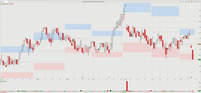 -- Jumbo: Ανώμαλη προσγείωση χθες για τη μετοχή (-4,19%) μετά την εκτίμηση της εταιρείας ότι η αύξηση τζίρου θα κυμανθεί στο χαμηλό άκρο (8%) της αρχικής εκτίμησης, όπως και των κερδών η αύξηση θα κυμανθεί μεταξύ 8% και 10%. Η αρνητική αυτή αναθεώρηση αποδίδεται από την εταιρεία στην πορεία των πωλήσεων του πρώτου εξαμήνου (+8%), τις καθυστερήσεις στις παραλαβές των προϊόντων και τη μετάθεση του ανοίγματος της Timisoara 2 στη Ρουμανία για αρχές του 2025. Μάλιστα, στην περίπτωση που οι παρούσες συνθήκες χειροτερεύσουν, κάτι που λογικά αναμένεται, εκτιμάται ότι ο ρυθμός αύξησης των πωλήσεων θα μπορούσε να περιοριστεί στο +4% με την κερδοφορία να κυμαίνεται στα επίπεδα του 2023. Ευτυχώς ο Απόστολος Βακάκης είχε την αγαθή τύχη μαζί του και πούλησε 4 εκατομμύρια μετοχές του (το 3% της εταιρείας), μέσω ιδιωτικής τοποθέτησης σε επενδυτές, τον περασμένο Μάϊο, στα 27,3 ευρώ ανά μετοχή.