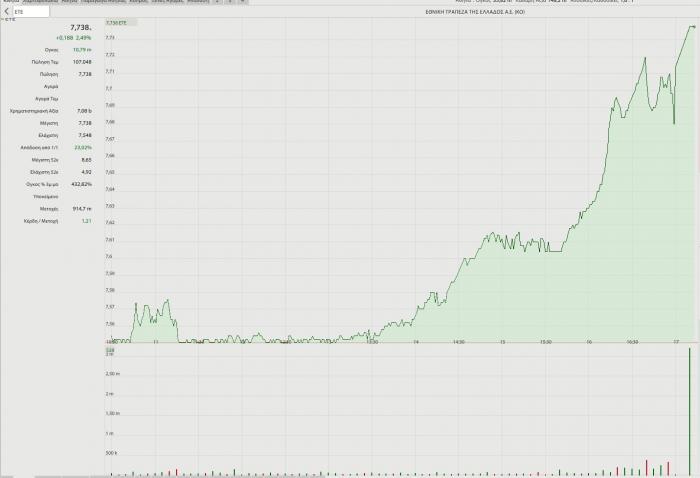 -- Πειραιώς: Ζωηρή από το ξεκίνημα της συνεδρίασης, αποτέλεσε σηματωρό της ανάκαμψης της Παρασκευής. Η μετοχή και η τράπεζα βρίσκονται στην πρώτη γραμμή του ενδιαφέροντος εδώ και καιρό και δικαίως: παράλληλα με τη ριζική εξυγίανση του χαρτοφυλακίου της, η διοίκηση «έχτισε» συστηματικά το στόρι για τη μετά κρίση εποχή (εξαγορές στο wealth management, ψηφιακή τράπεζα κ.α.) ενώ παράλληλα ενισχύει τη θέση της στην τραπεζική αγορά. Η δε επένδυση στη Snappi και μετρίως καλά να πάει θα κάνει μεγάλη διαφορά, προοπτική που ακόμα δεν φαίνεται να έχει αποτιμήσει η αγορά.
