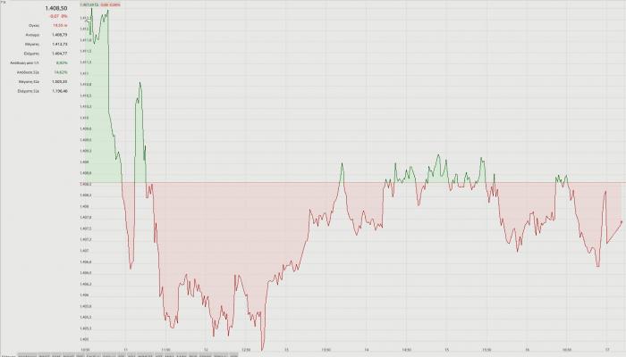 Είναι χαρακτηριστικό ότι ο ΓΔ έγραψε υψηλό ημέρας τις 1.412,73 μονάδες και ελάχιστο στις 1.404,77 μονάδες για να κλείσει τελικά στις 1.408,5 μονάδες με ανεπαίσθητη πτώση -0,01%.