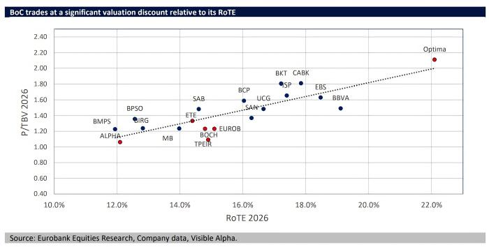 Η Κύπρου με την Πειραιώς και τη Eurobank είναι χαμηλότερα από τράπεζες με χαμηλότερη απόδοση στα κεφάλαια. Χαρακτηριστικό παράδειγμα η Banco de Sabadell που έχει υψηλότερο P/TBV αν και με ανάλογο RoTE σε σύγκριση με τις ελληνικές.