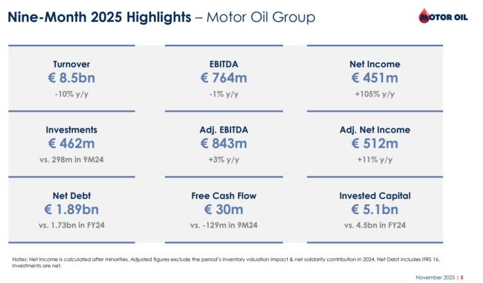 ΜOTOR OIL: Στα 843 εκατ. ευρώ ανήλθαν τα προσαρμοσμένα EBITDA της Motor Oil στο εννεάμηνο σημαντικά ανώτερα από τις εκτιμήσεις των αναλυτών, ενώ τα καθαρά κέρδη ανήλθαν στα 512 εκατ. ευρώ, ανώτερα επίσης των εκτιμήσεων. Οι επενδυτές το περίμεναν και έστειλαν τη μετοχή σε ιστορικά υψηλά.