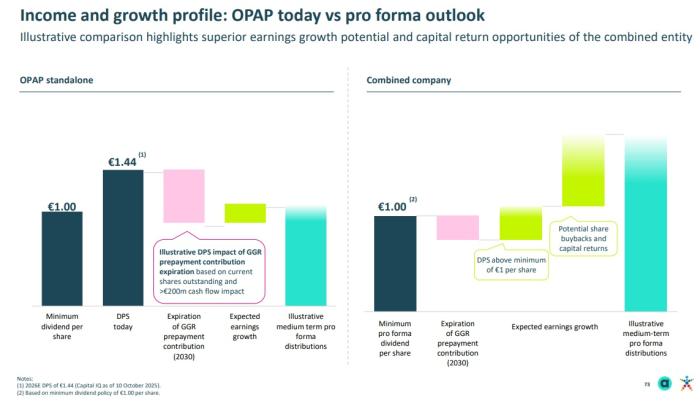 Όμως ο ΟΠΑΠ ξεκίνησε τα υψηλά μερίσματα λόγω της προκαταβολής της συνεισφοράς του λεγόμενου GGR (έσοδα προ εισφορών) που όμως λήγει το 2030 και θα επηρεάσει τις ταμειακές ροές άνω από 200 εκατ. ευρώ. Ενώ αν γίνει η συγχώνευση η διανομή θα παραμείνει στο 1 ευρώ (τουλάχιστον) και το growth θα είναι σημαντικά μεγαλύτερο.