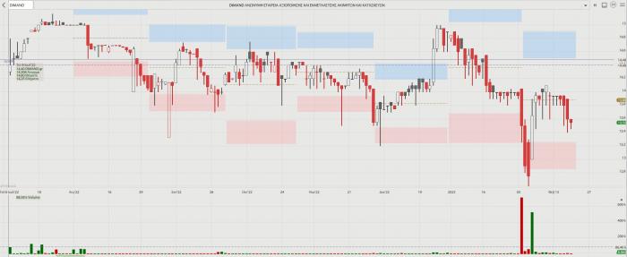 -- Dimand: Σε μια φουλ ανοδική αγορά, εξακολουθεί να μην μπορεί να βρει τα «πατήματά» της. Στα 13,55 ευρώ με την τέταρτη σερί πτωτική συνεδρίαση, ενώ στις 14 συνεδριάσεις του Φεβρουαρίου, έχει μόλις τέσσερις ανοδικές. Υποχωρεί 9,06% φέτος, εξακολουθεί σε μόνιμη βάση κάτω από την τιμή εισαγωγής. Ασχέτως αν πρόκειται για εταιρεία – πρωτοπόρο στην ανάπτυξη ακινήτων, με εξαιρετικά διαπιστευτήρια (κτήριο Αγγελικούση, κεντρικά Cosmote, γήπεδο ΑΕΚ, κτήριο Kaizen κ.α.), εντούτοις, το γεγονός ότι μια νεοεισηγμένη δεν έχει καλό αποτύπωμα στο Χ.Α., δεν είναι καλό για την αγορά. Γενικώς ο κλάδος των ακινήτων δεν… συγκινεί τους επενδυτές έως τώρα.