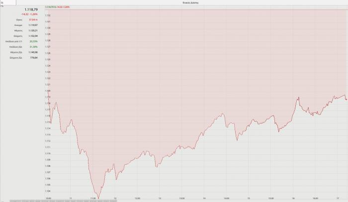 Ο Γενικός Δείκτης έκλεισε στις 1.118,79 μονάδες με πτώση 1,26%, πολύ κοντά στο υψηλό ημέρας που ήταν στις 1.120,21 μονάδες (-1,14%). Το χαμηλό ημέρας ήταν στις 1.102,94 μονάδες όταν ο Γ.Δ. υποχωρούσε κατά 2,66% στις 11:39 π.μ. Είναι θετικό για την αγορά ότι κράτησε το όριο των 1.100 μονάδων που είναι κρίσιμο για την ψυχολογία της αγοράς, ενώ αυτό το όριο δεν παραβιάστηκε ούτε στο χαμηλό ημέρας της αγοράς. Τεχνικοί αναλυτές λένε ότι είναι κρίσιμο για να κρατηθεί η ανοδική δυναμική να μην χάσει ο Δείκτης τις 1.115 μονάδες και, προς παρόν, το όριο αυτό κρατιέται.