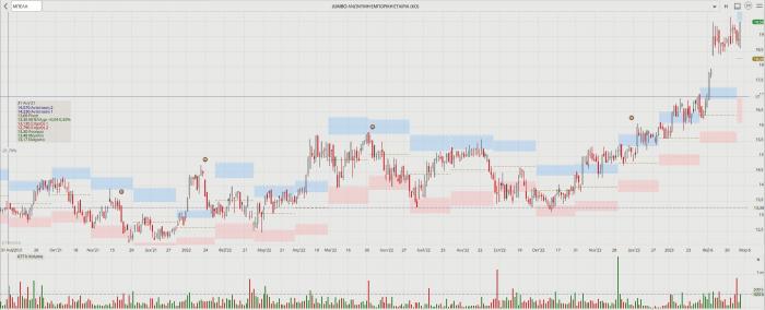-- Jumbo: Όταν σε τέτοια συνεδρίαση όχι μόνο πας κόντρα στο ρεύμα με άνοδο 3,23%, αλλά κλείνεις στα 19,50 ευρώ που είναι νέα ιστορικά υψηλά, τότε σημαίνει ότι έχεις ξεχωριστό «μέταλλο». Αξιοσημείωτη η συνέπεια της μετοχής σε κάθε κλίμα. Το προηγούμενο (σε κλείσιμο) ιστορικό υψηλό ήταν στα 19,46 ευρώ, αλλά πριν τον Covid-19! Ήταν από τις 24 Ιανουαρίου 2020, δηλαδή λίγο πριν τα lockdown και τα κλεισίματα. Αυτό σημαίνει ότι η μετοχή έκλεισε τον κύκλο της πανδημίας και βάζει πλώρη για το σπάσιμο και των 20 ευρώ.