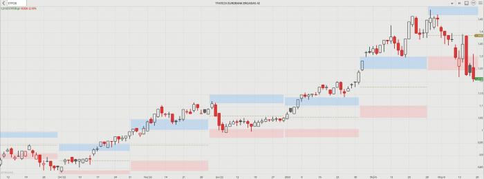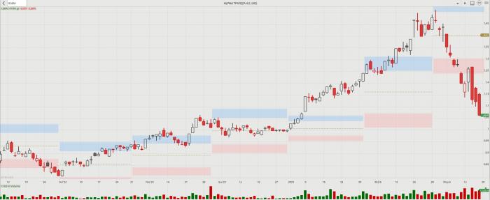 -- Alpha Bank: Με -42,19% από τα υψηλά του 2023, η μετοχή έχει καταγράψει τις μεγαλύτερες απώλειες στη βίαιη διόρθωση του Μαρτίου. Από την αρχή του έτους τα κέρδη της έχουν περιοριστεί στο φτωχό +6,45% έναντι +21,87% του τραπεζικού δείκτη και +18,34% του Γενικού Δείκτη. Είναι εύλογο να περιμένει κανείς ένα δυναμικό ριμπάουντ μόλις η ορατότητα στον κλάδο αποκατασταθεί, δεδομένης μάλιστα τις ουσιαστικής ενδυνάμωσης του ισολογισμού της Alpha Bank, όπως αποτυπώθηκε στα αποτελέσματα του 2022, αλλά και της εξισορρόπησης της συγκριτικής αποτίμησής της σε σχέση με τις άλλες συστημικές τράπεζες.
