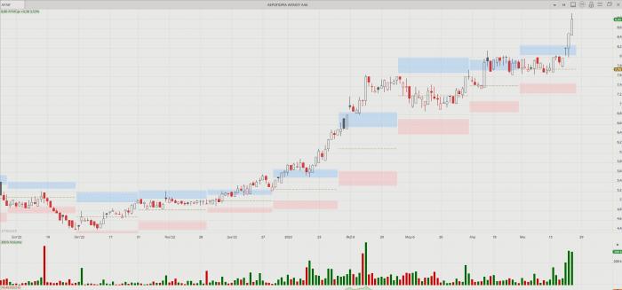 -- Aegean – warrants: Πάντως, αυτό που προεξοφλεί η αγορά είναι ότι η εταιρεία, σε συνεννόηση με την κυβέρνηση, θα ξεκαθαρίσει πολύ γρήγορα την εκκρεμότητα με τα warrants. Η περίοδος που μπορεί να γίνει αυτό είναι από την 1η Ιουλίου, άρα σε περίπου 35 ημέρες και, όπως φαίνεται, το γεγονός ότι η Ν.Δ. πέτυχε εμφατική νίκη στις εκλογές βοηθάει προς αυτή την κατεύθυνση. Θυμίζουμε πως την άνοιξη του 2021 η εταιρεία είχε κάνει αύξηση κεφαλαίου κατά 60 εκατ. ευρώ, με το Δημόσιο να καταβάλει στην εταιρεία κρατική ενίσχυση 120 εκατ. ευρώ για την αποκατάσταση της ζημιάς που υπέστη λόγω της πανδημίας του κορονοϊού. Έτσι, το Δημόσιο έφτασε να κατέχει 10.369.217 τίτλους παραστατικών δικαιωμάτων κτήσης 10.369.217 κοινών μετοχών της Aegean Airlines, που αντιστοιχεί περίπου στο 11,50% του μετοχικού κεφαλαίου της εισηγμένης. Το Δημόσιο είχε μπει στα 3,20 ευρώ, ενώ τώρα η μετοχή είναι στα 8,80 ευρώ, άρα το κέρδος για το κράτος θα είναι 5,6 ευρώ ανά μετοχή. Με το momentum που έχει η μετοχή, συμφέρει την εταιρεία να κλείσει αυτή την εκκρεμότητα το ταχύτερο δυνατό. Παράλληλα, θα απελευθερώσει την εταιρεία ώστε να μπορεί να δίνει μέρισμα στους μετόχους της, ή να προχωρήσει σε εξαγορές στο εξωτερικό (Ρουμανία, Κροατία κ.λπ.), κάτι που τώρα, λόγω της δέσμευσης με το Δημόσιο, δεν μπορεί να κάνει.