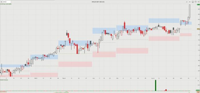 -- Epsilon Net: Νέα ιστορικά υψηλά τα 9 ευρώ μετά και το χθεσινό +5,88%, με την αποτίμηση πλέον να έχει… ξεχειλώσει στα 487,8 εκατ. ευρώ. Έχει μακράν τη μεγαλύτερη αποτίμηση στον κλάδο της πληροφορικής στη χώρα, ενώ αποτελεί και επιλαχούσα για τον FTSE 25. Η Profile Software (επίσης σε ιστορικά υψηλά) αποτιμάται στα 114 εκατ. ευρώ, η Entersoft στα 154,8 εκατ. ευρώ, η Space Hellas μόλις στα 53,5 εκατ., Η Quality & Reliability στα 20,6 εκατ. ευρώ, η Ίλυδα στα 12,5 εκατ., η Logismos στα 5,54 εκατ. κ.ο.κ. Κάτι κάνουν καλά κάποιοι στην Epsilon Net.