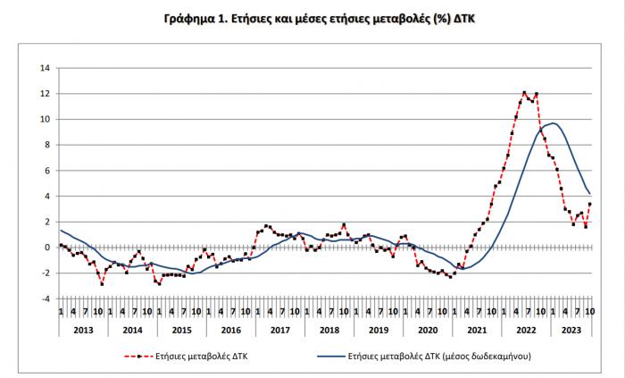 - Ο μέσος ΔΤΚ του δωδεκαμήνου Νοεμβρίου 2022 - Οκτωβρίου 2023, σε σύγκριση με τον αντίστοιχο Δείκτη του δωδεκαμήνου Νοεμβρίου 2021 - Οκτωβρίου 2022, παρουσίασε αύξηση 4,2%, έναντι αύξησης 9,2% που σημειώθηκε κατά την αντίστοιχη σύγκριση του δωδεκαμήνου Νοεμβρίου 2021 - Οκτωβρίου 2022 με το δωδεκάμηνο Νοεμβρίου 2020 - Οκτωβρίου 2021