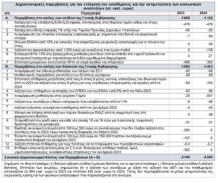 Ο προϋπολογισμός του 2024, ενσωματώνει μόνιμες φοροελαφρύνσεις και εισοδηματικές ενισχύσεις ύψους 1,6 δισ. ευρώ για πάνω από 3 εκατ. νοικοκυριά ενώ η πρόβλεψη περί πρωτογενούς πλεονάσματος διαμορφώνεται στο 2,1% του ΑΕΠ έναντι 1,1% στον προϋπολογισμό του 2023.