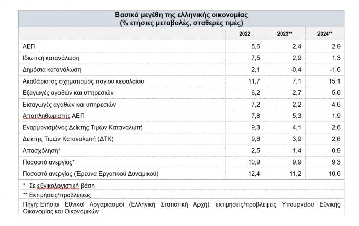 Όπως σημειώνει το υπουργείο Εθνικής Οικονομίας και Οικονομικών ο ρυθμός ανάπτυξης παραμένει πλησίον των στόχων που έχουν τεθεί στο Πρόγραμμα Σταθερότητας του Απριλίου 2023 και αναμένεται να ανέλθει σε 2,4% το 2023 και 2,9% το 2024. Το Ακαθάριστο Εγχώριο Προϊόν σε ονομαστικούς όρους αναμένεται να αυξηθεί από 206,6 δισ. ευρώ το 2022 σε 222,8 δισ. ευρώ το 2023 και 233,8 δισ. ευρώ το 2024. Παράλληλα, ο Εναρμονισμένος Δείκτης Τιμών Καταναλωτή αναμένεται να κυμανθεί σε ελαφρώς χαμηλότερα επίπεδα και να διαμορφωθεί σε 4,1% έναντι 4,5% που προβλεπόταν στο Πρόγραμμα Σταθερότητας για το 2023 και να αποκλιμακωθεί περαιτέρω σε 2,6% για το 2024. Οι επενδύσεις αναμένεται να αυξηθούν κατά 7,1% κατά το τρέχον έτος και ακόμη περισσότερο κατά 15,1% το 2024, ενώ η ανεργία αναμένεται να μειωθεί από 11,2% το 2023 σε 10,6% το 2024.