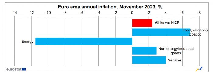 Σύμφωνα με την ανακοίνωση της Eurostat, τα τρόφιμα, το αλκοόλ και ο καπνός αναμένεται να έχουν τον υψηλότερο ετήσιο ρυθμό τον Νοέμβριο (6,9%, έναντι 7,4% τον Οκτώβριο), ακολουθούμενα από τις υπηρεσίες (4,0%, έναντι 4,6% τον Οκτώβριο), τα μη ενεργειακά βιομηχανικά αγαθά (2,9%, έναντι 3,5% τον Οκτώβριο) και την ενέργεια (-11,5%, έναντι -11,2% τον Οκτώβριο).