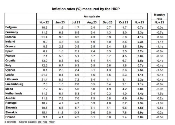 Συνεχίστηκε η αποκλιμάκωση του πληθωρισμού στην ευρωζώνη τον Νοέμβριο, με τη Eurostat να εκτιμά ότι έχει υποχωρήσει στο 2,4% από 2,9% που ήταν τον προηγούμενο μήνα, ενώ πορεία υποχώρησης -αντιστρέφοντας το κλίμα του Οκτωβρίου- ακολούθησε ο Εναρμονισμένος Δείκτης Τιμών Καταναλωτή και για την Ελλάδα, καθώς διαμορφώθηκε στο 3% από 3,8% που ήταν τον προηγούμενο μήνα.