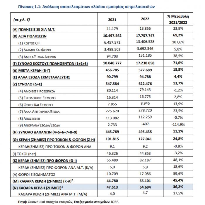 Όπως σημειώνεται στη μελέτη η αύξηση των πωλήσεων οφείλεται στην ενίσχυση του όγκου πωλήσεων και στην κατακόρυφη άνοδο των διεθνών τιμών των προϊόντων πετρελαίου, η οποία το 2022 οδήγησε σε αύξηση του κόστους πωληθέντων κατά 71,6% έναντι του 2021.